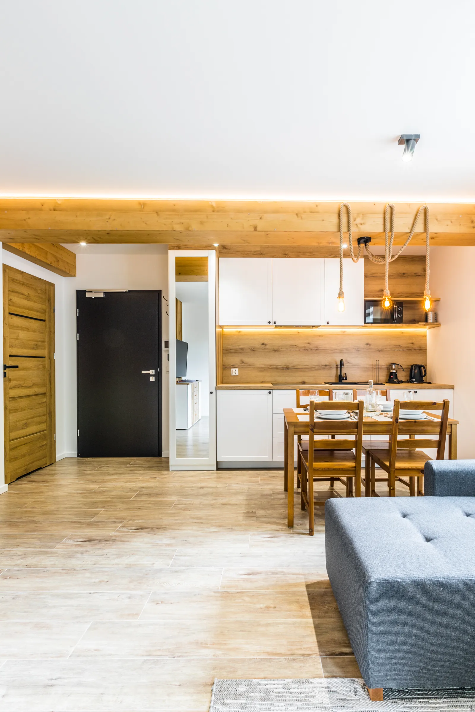 Aneks kuchenny: zabudowa kuchenna z lodówką, płytą indukcyjną, zmywarką, piekarnikiem, mikrofalą i zlewozmywakiem oraz okapem. Wyposażony jest w czajnik, garnki i patelnie, zastawę stołową dla 4 osób.