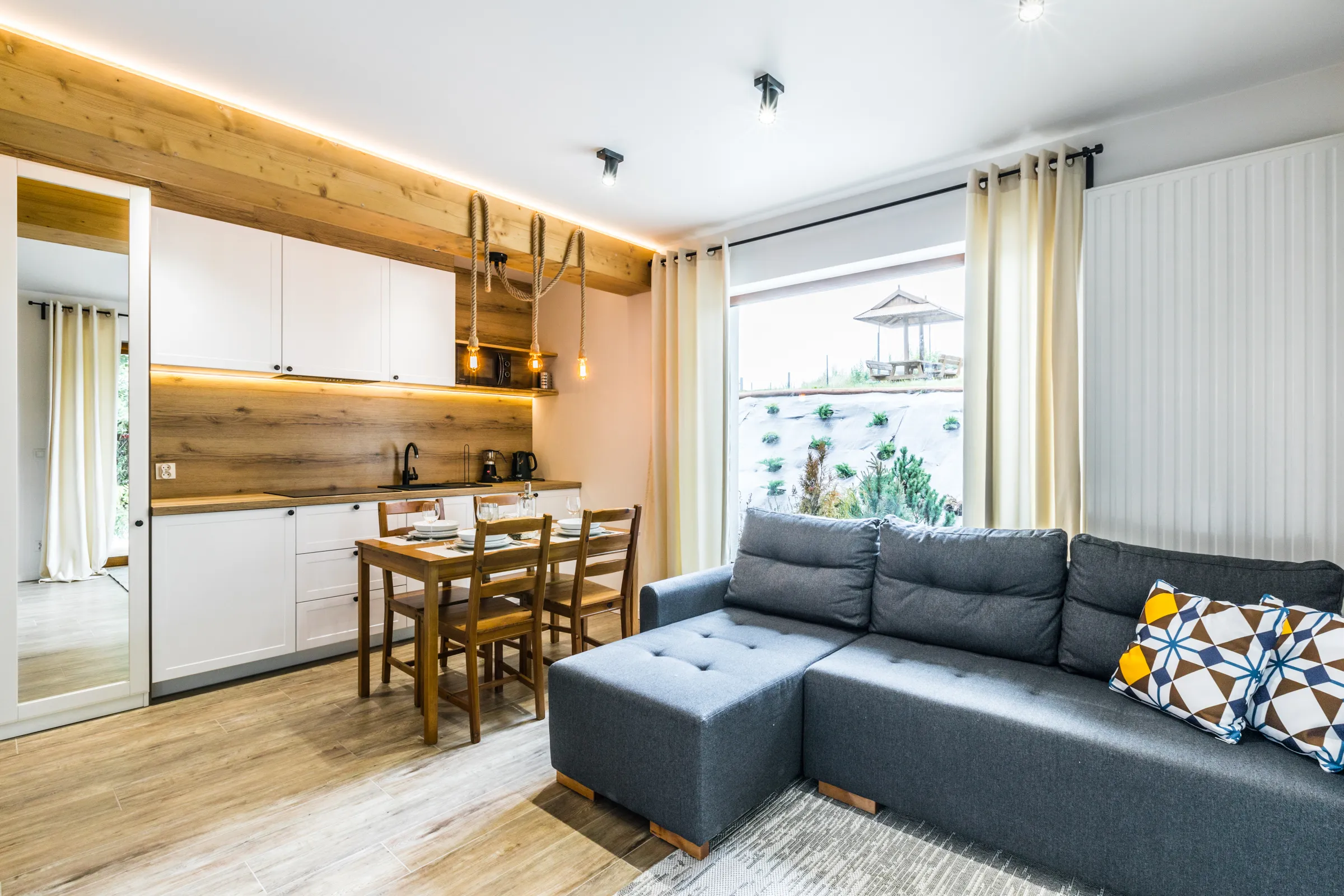 Mieszkanie o powierzchni 35 m2, idealne dla 4 osób znajduje się na pierwszym piętrze. Składa się z kuchni połączonej z salonem w którym znajduje się rozkładana sofa dla 2 osób, osobnej sypialni z łożem małżeńskim, przedpokoju i łazienki z prysznicem. W salonie oraz sypialni jest wyjście na balkon z którego roztacza się piękny widok na Polane Lipki i Giewont.