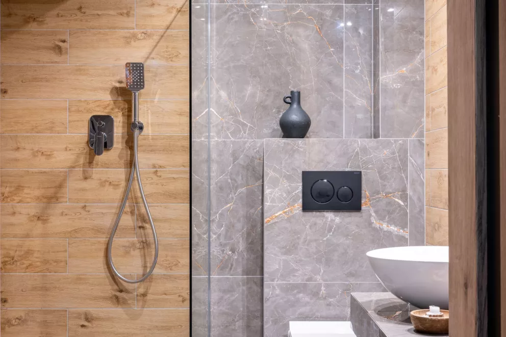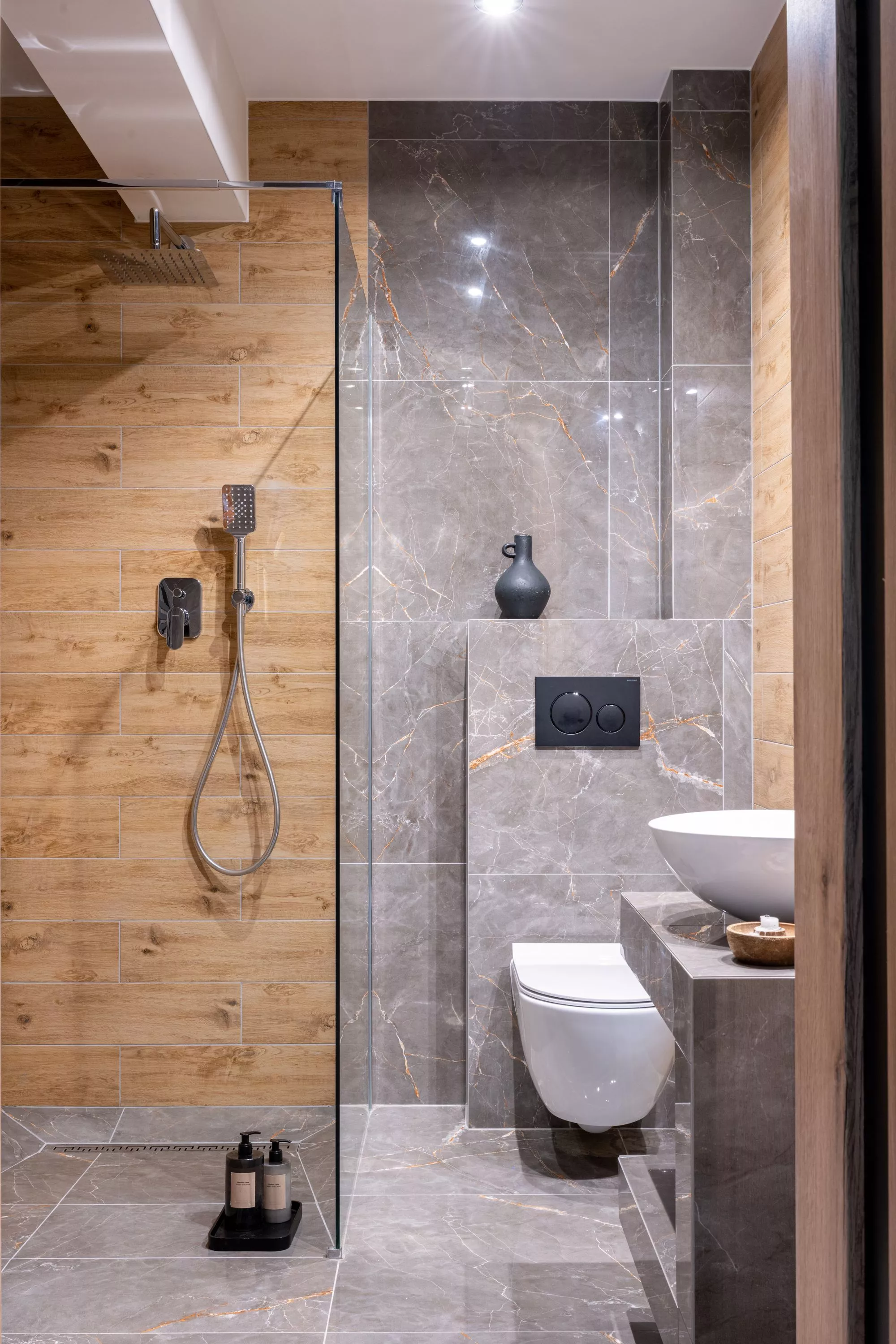 Łazienka: prysznic, toaleta, umywalka, szafka, lustro, grzejnik łazienkowy, suszarka, ręczniki.